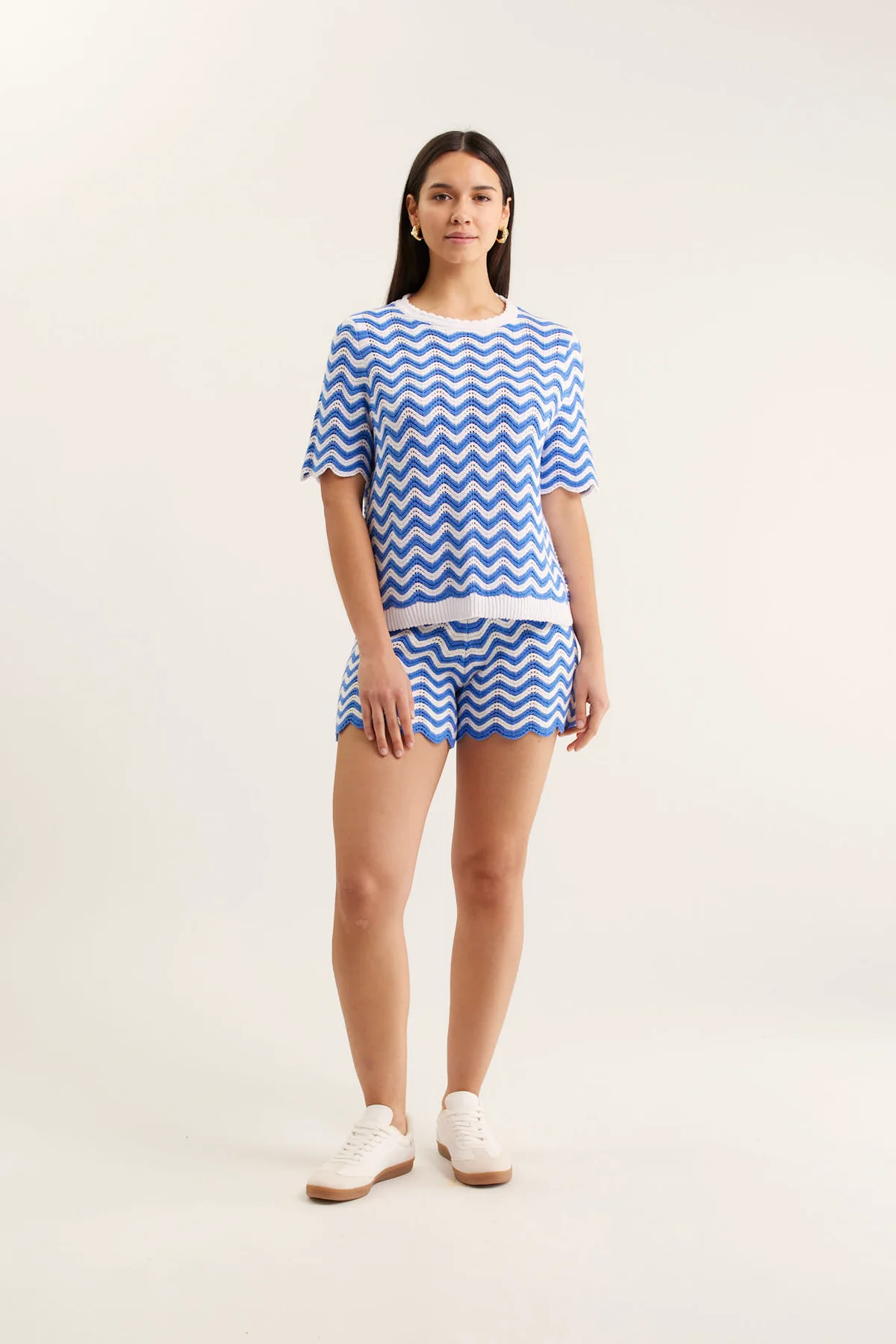 • Scalloped edge finish on neck and sleeves, wave finish on hem