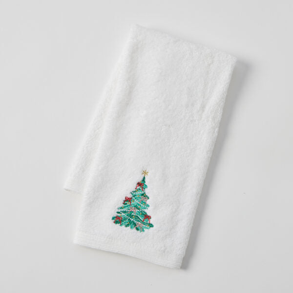 The Christmas Cheer Hand Towel blends classic motifs with whimsical detail to create a festive bathroom accent. Made from soft cotton, each towel is embroidered with a seasonal scene