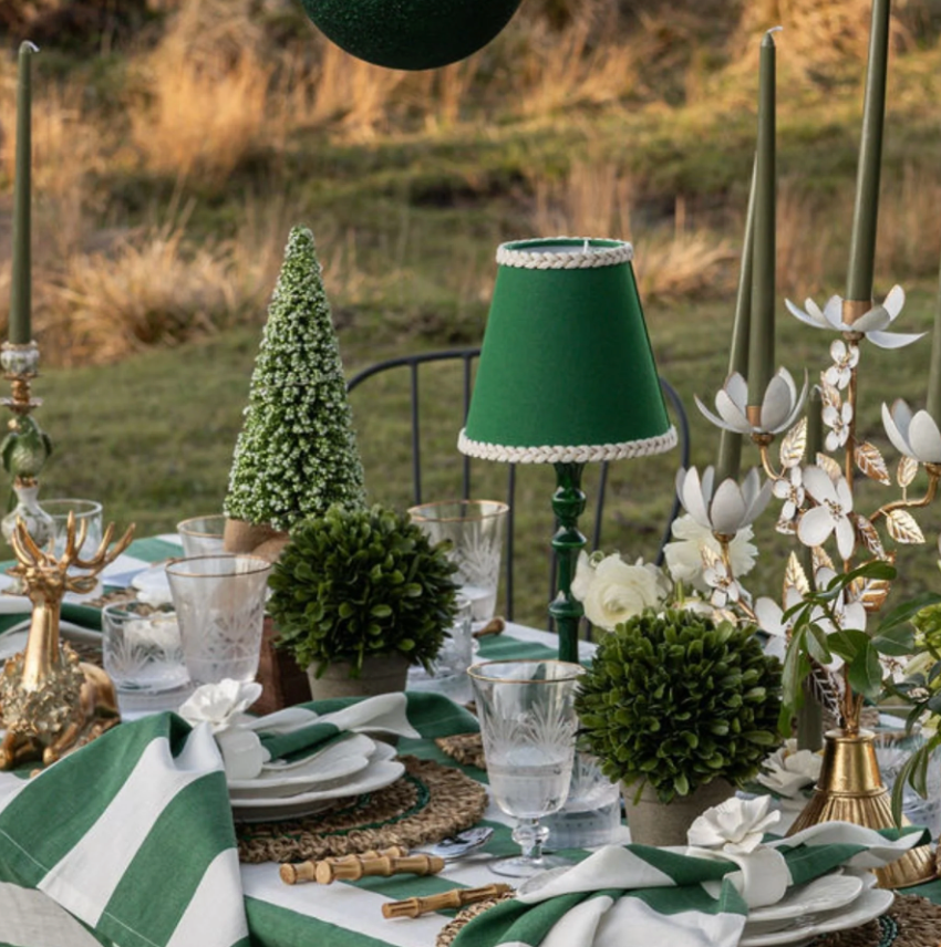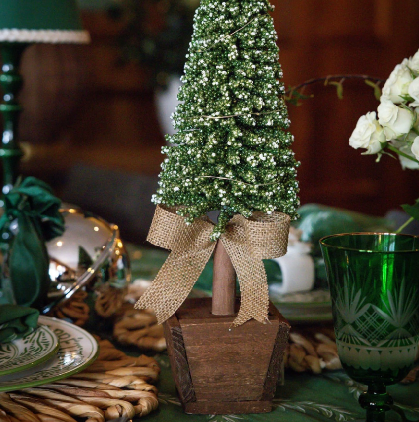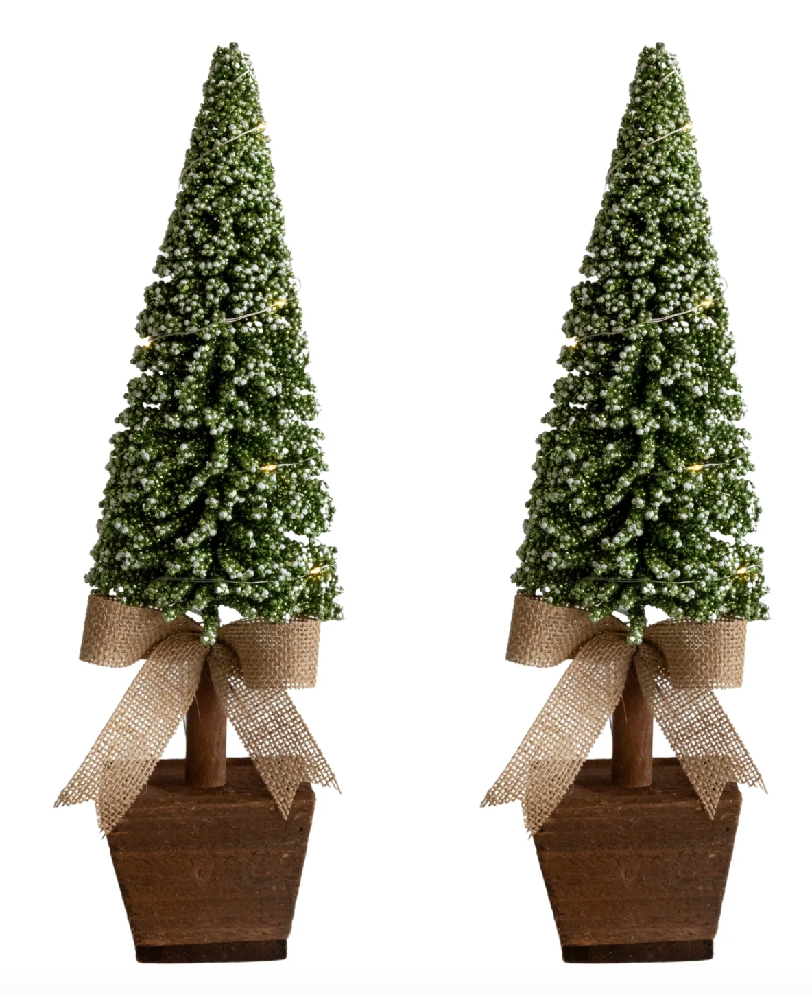 A gorgeous set of Christmas trees wrapped in fairy lights and finished with a bow at the base. A charming duo that brings a soft glow and a touch of magic to your holiday table.