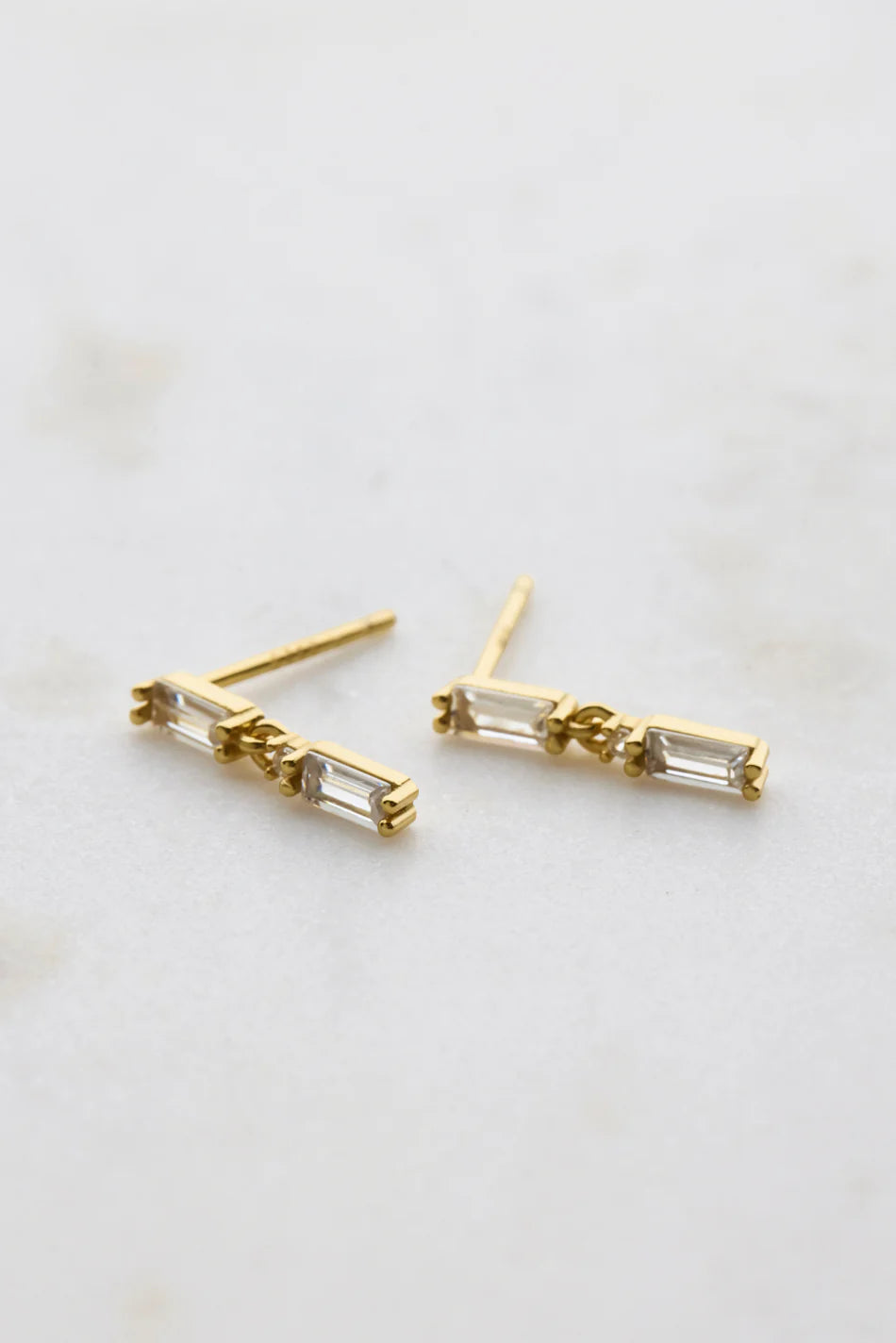 These double-drop crystal studs feature blush coloured crystals that radiate a soft and feminine sparkle. With their petite size, they are perfect for adding a touch of glamour to your earring stack.