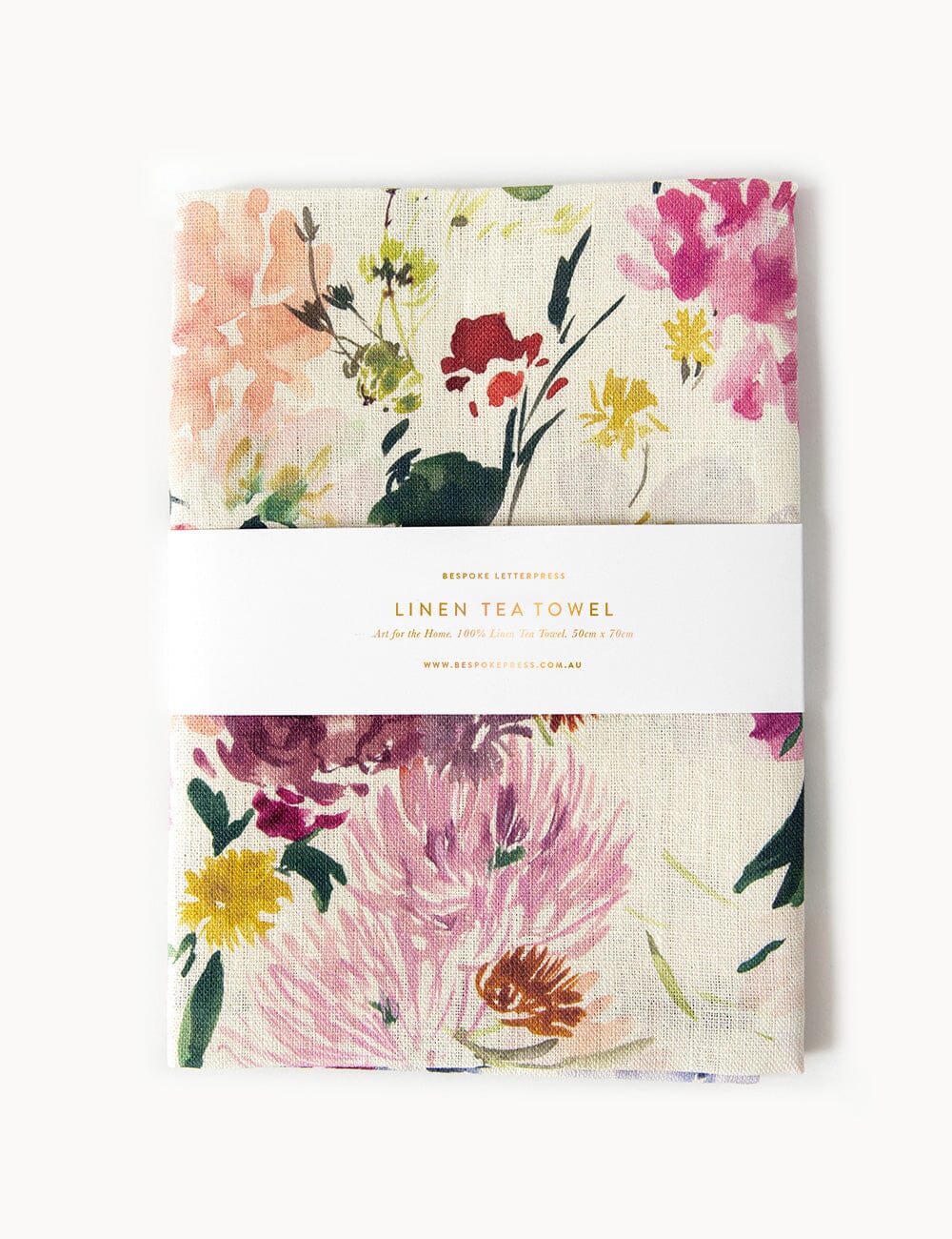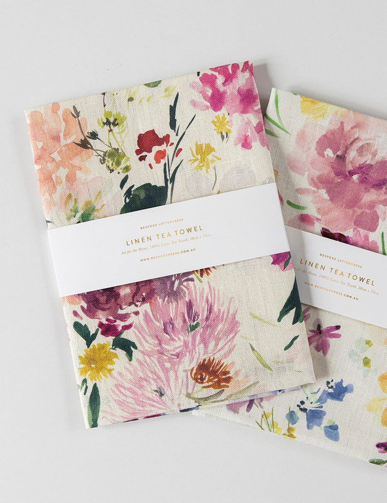 Artwork by Bethany Linz and printed on 100% Linen Tea Towel. Supplied folded with a gold foil printed removable bellyband.